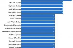 5次:维拉&卢顿、布莱顿&切尔西、利兹联&热刺、曼联&森林