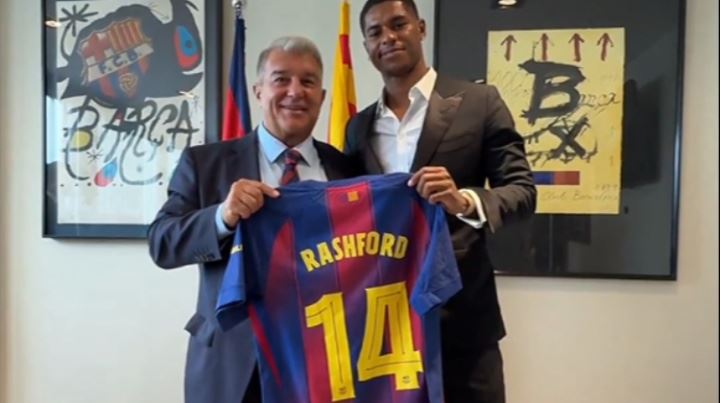 巴萨官推晒视频,拉什福德与拉波尔塔一起手持巴萨14号球衣,配文:“我们的新14号❤️”。
